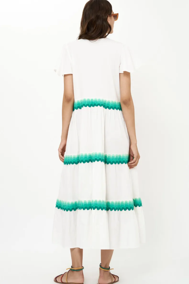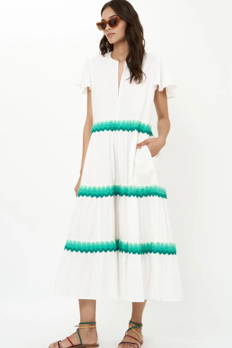 Crafted from cotton poplin and exquisitely tailored with flutter sleeves, this dress boasts a fluid, a-line silhouette that exudes grace and elegance.